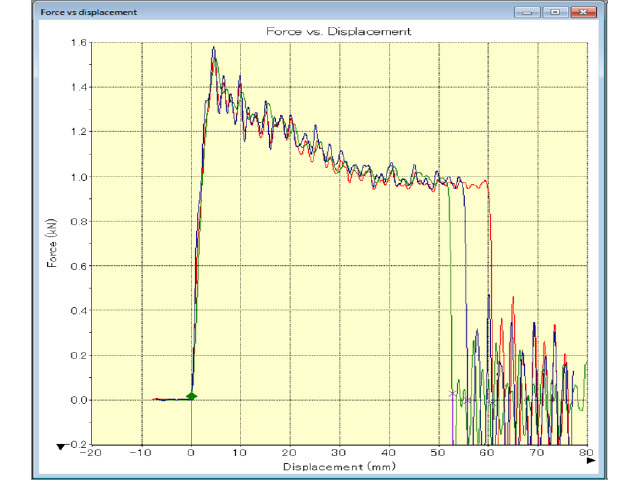 3回の試験データは良好な再現性が得られており、最大荷重までの立ち上がりと50㎜程度の変位まで試験データは重なります。落錘の重量を調整したり、落下高さを変えることで衝撃エネルギーや速度を幅広い範囲で設定することが可能です。また、高速衝撃オプションにより最大20m/秒の高速引張試験にも対応します。これまで得られなかった高ひずみ速度の引張試験を可能にしています。