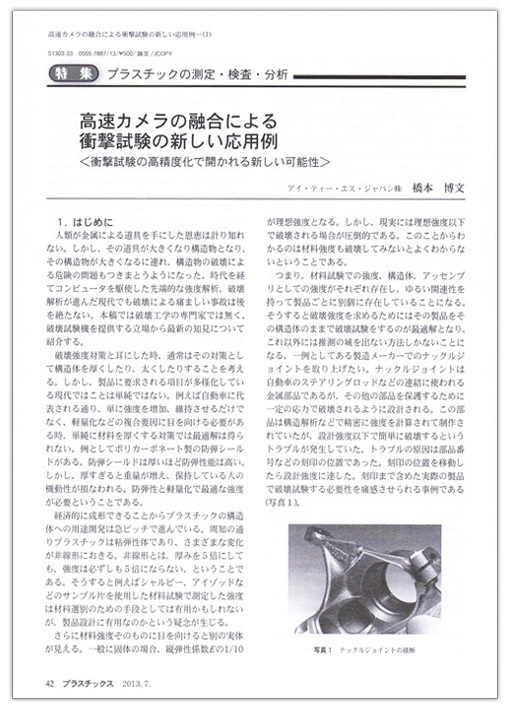 「プラスチックス 2013年7月号」にて掲載された衝撃試験機に関する記事です。