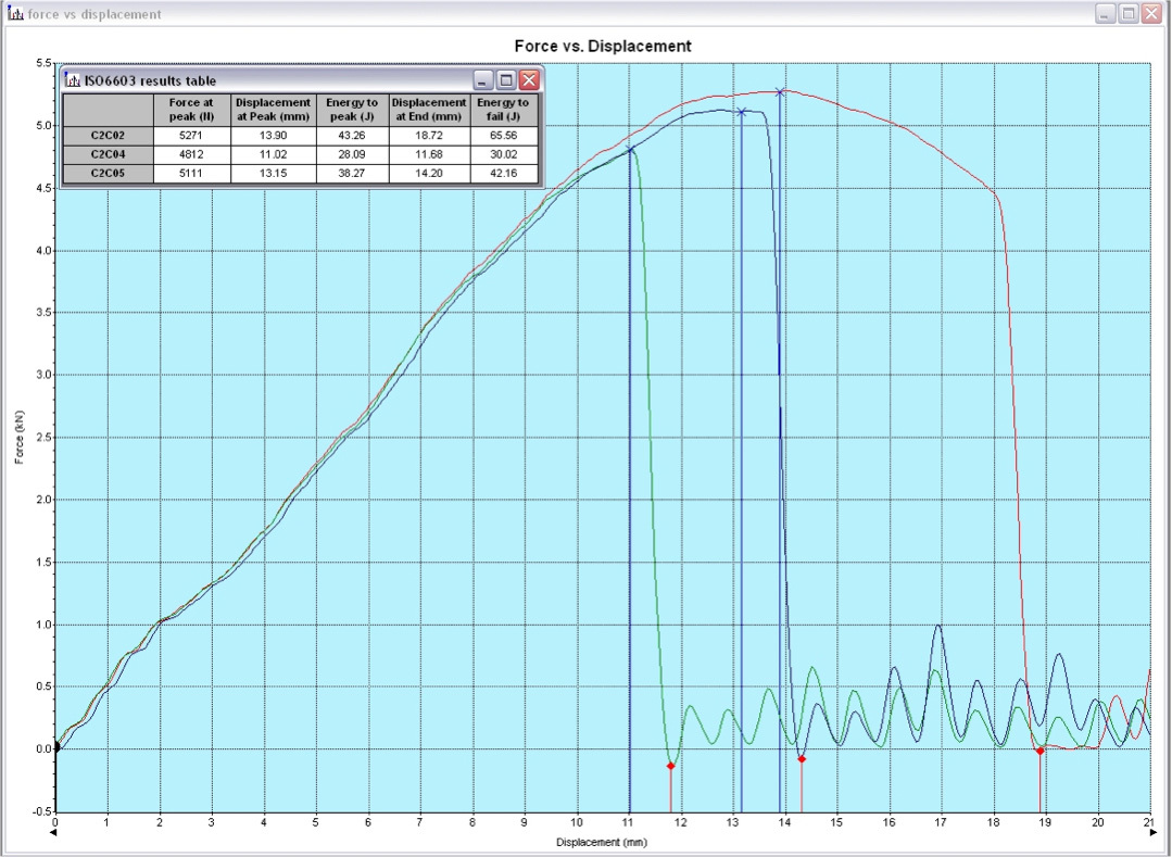 あるメーカーの自動車用部材で塗色によりクラッシュテストの壊れ方が異なるケースがあった。衝撃試験機で精密な実験をしたのが〈図:01〉である。ベースの樹脂材料が同じため、破壊までのエネルギー吸収曲線は同じである。図らずも衝撃試験機の再現性試験のようになっている。しかし、その後塗色により破壊に至る必要エネルギーが異なっているのが一目瞭然である。
