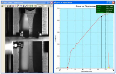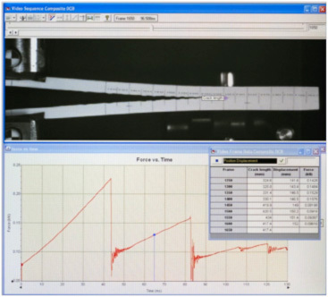 一例が航空機製造会社で使用されているカーボン複合材の剥離強度試験である。これはダブルカンチレバービーム試験を使用する。接着剤で接合されたカーボン複合材2層の下側の層に衝撃を与え、その破壊エネルギーを固定した上側層のフォースで測定すると同時に、亀裂の伝播速度を画像解析で求めるものである〈写真2〉。衝撃による最初の剥離の変形量も左に設置したメジャーにより画像解析できるようになっている。